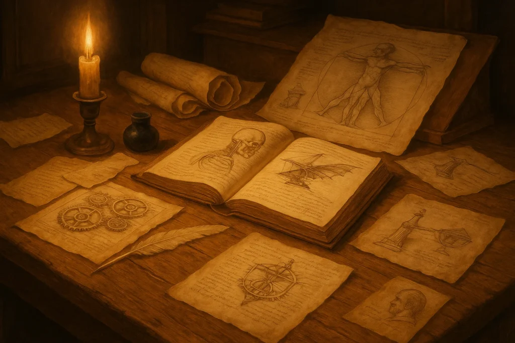 En estos códices encontramos desde estudios anatómicos detalladísimos hasta diseños de máquinas que anticipaban el helicóptero, el tanque de guerra, la bicicleta y el paracaídas. También dejó esbozos sobre óptica, hidráulica, arquitectura, astronomía y geología. Cada página es una muestra de su pensamiento en constante ebullición.