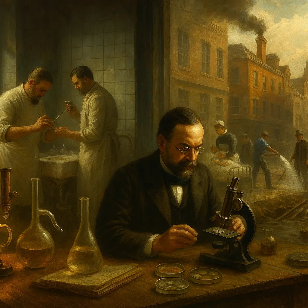 A fines del XIX, Louis Pasteur y Robert Koch demostraron que microorganismos específicos causan enfermedades concretas. Esta revolución microbiana impulsó vacunas, antisepsia, esterilización, refrigeración de alimentos y control de epidemias. Cambió hospitales, quirófanos y ciudades, reduciendo drásticamente la mortalidad.